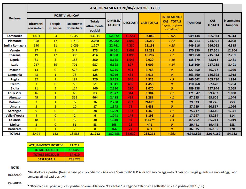 Bollettino nazionale del 20 giugno, il totale delle persone che hanno contratto il virus è di 238.275*, con un incremento rispetto a ieri di 262 nuovi casi.