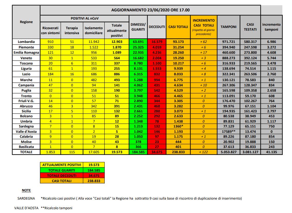 Bollettino nazionale del 23 giugno, il totale delle persone che hanno contratto il virus è di 238.833, con un incremento rispetto a ieri di 122 nuovi casi.