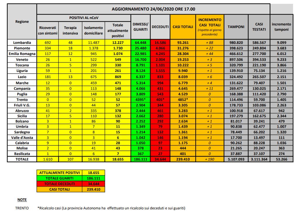 Bollettino nazionale del 24 giugno, il totale delle persone che hanno contratto il virus è di 239.410, con un incremento rispetto a ieri di 190 nuovi casi.