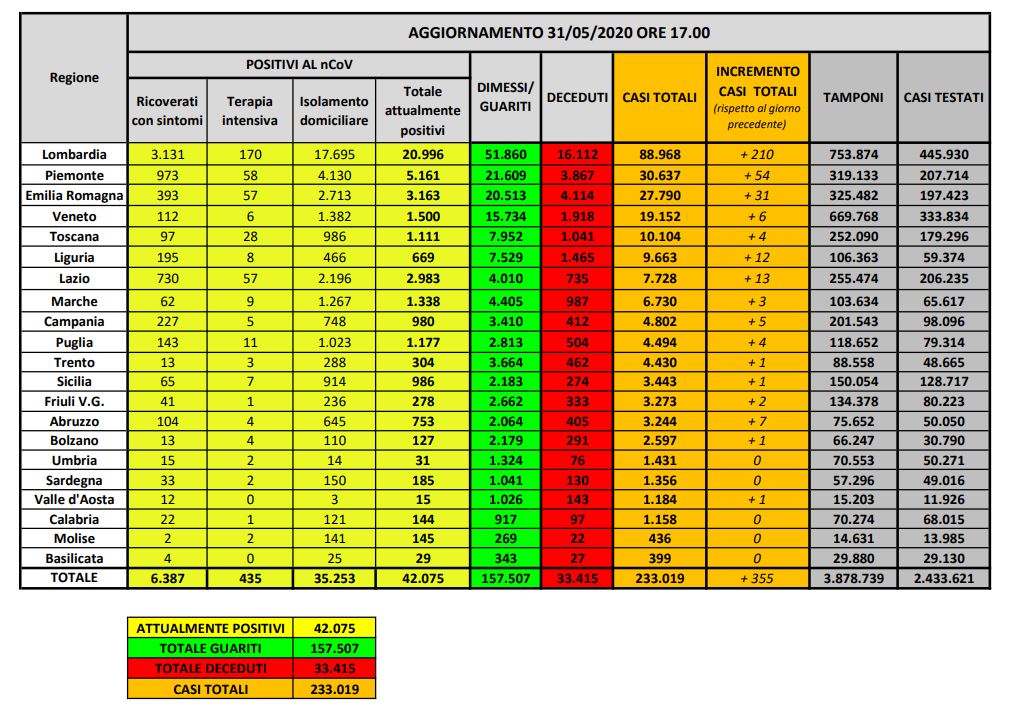 Bollettino nazionale del 31 maggio, il totale delle persone che hanno contratto il virus in Italia dall’inizio dell’epidemia è di 233.019, con un incremento rispetto a ieri di 355 nuovi casi.