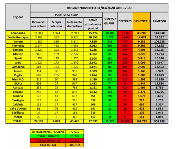 Bollettino nazionale del 31 marzo, aumento di contagi a quota 2107. Ancora 837 decessi
