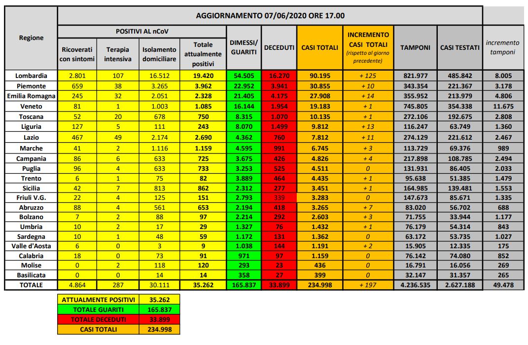 Coronavirus, bollettino nazionale del 7 giugno: sono 35262 le persone attualmente positive al Covid-19, con un calo di 615 positivi rispetto a ieri. Dall’inizio dell’epidemia sono 234.998 le persone contagiate in Italia. Nelle ultime 24 ore si registrano quindi 197 nuovi casi certificati. Si registrano inoltre 53 decessi (33.899 il totale) e 759 tra dimessi e guariti (165.837 il totale). Calano ulteriormente i ricoverati con sintomi (sono 4684, – 138 rispetto a ieri) e i pazienti ricoverati in terapia intensiva: al momento sono 287, -6 rispetto a sabato. La stragrande maggioranza dei pazienti positivi, 30.582, si trova in isolamento domiciliare, senza sintomi o con sintomi lievi. Nelle ultime 24 ore sono stati processati 49.478 tamponi.