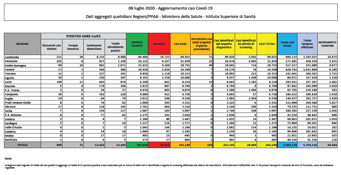 Bollettino nazionale dell’8 luglio, i nuovi casi certificati nelle ultime 24 ore sono 193. A questi si aggiungono 37 persone risultate positive al test molecolare, identificate a seguito dello screening effettuato allo sbarco del volo Dacca-Roma Fiumicino atterrato l’altro ieri nello scalo romano. Dall’inizio dell’epidemia sono 242.149 le persone colpite da Covid-19 in Italia, mentre gli attuali positivi sono 13.595 (-647 rispetto a ieri). I morti registrati nelle ultime 24 ore sono 15 (34.914 il totale), i guariti e i dimessi 825 (193.640 il totale).