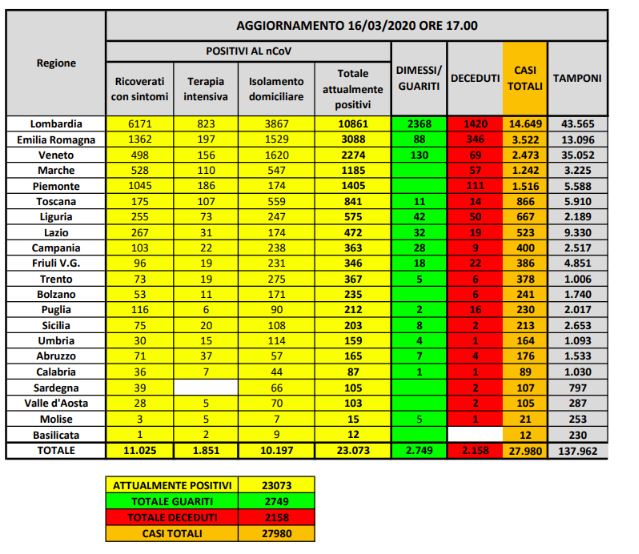 Sono 3233 i nuovi contagiati sul territorio nazionale nelle ultime 24 ore. Il totale delle persone contagiate dall’inizio dell’epidemia è di 27980 persone (23073 i positivi attuali, 2158 le vittime, 2749 le persone guarite. I decessi, nell’ultima giornata, sono stati 349. Sono 1451 le persone attualmente in terapia intensiva. Ad oggi sono stati fatti 137962 tamponi.