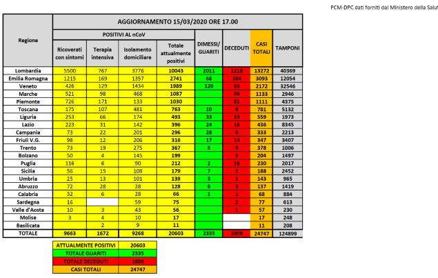 Sono 368 i decessi e 369 le guarigioni in un giorno. Questo l’ultimo dato nazionale fornito dalla Protezione Civile. Il numero totale dei contagiati (l’aumento è di 2853 unità nelle ultime 24 ore) ammonta a 24747 persone (20603 i positivi attuali, 2235 i guariti e 1809 le persone decedute). Sono 1672 le persone attualmente ricoverate in terapia intensiva, 124899 i tamponi eseguiti finora sul territorio nazionale.