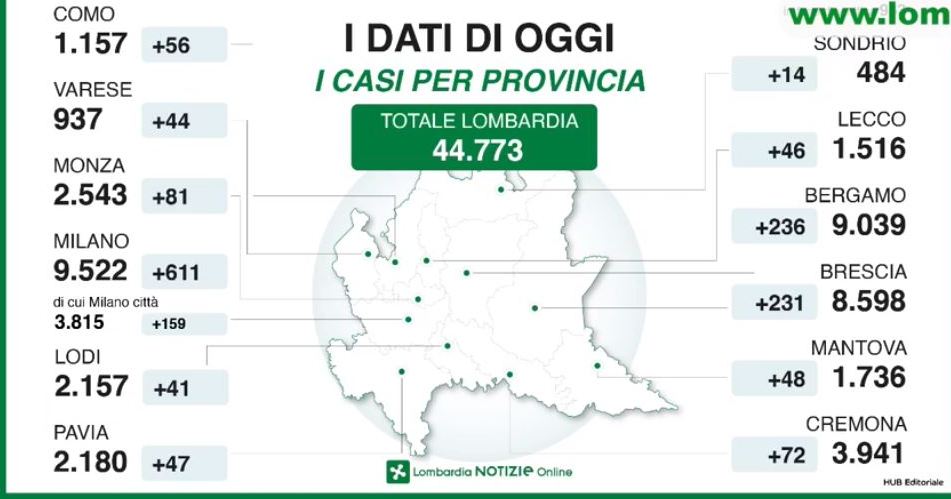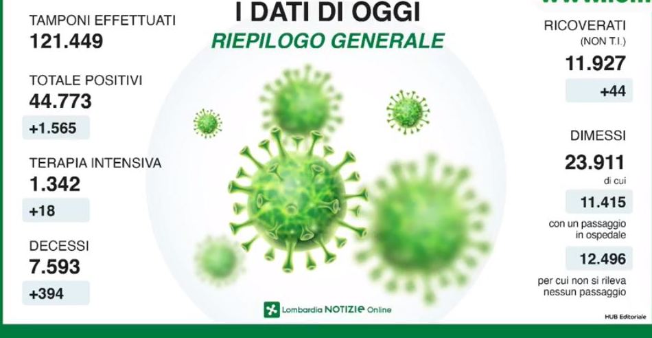 Discreti dati nelle ultime 24 ore in Lombardia. Si registra un aumento di 1565 contagi netti, in leggero aumento rispetto ai giorni precedenti, ma è aumentato in maniera consistente il dato dei tamponi analizzati (dai 3500 di ieri ai 6800 di oggi). Si registrano nelle ultime 24 ore ancora 394 decessi. L’aumento nella provincia di Bergamo è di 236 unità. Crescita abbastanza consistente nel Milanese. Di seguito tutti i dati.