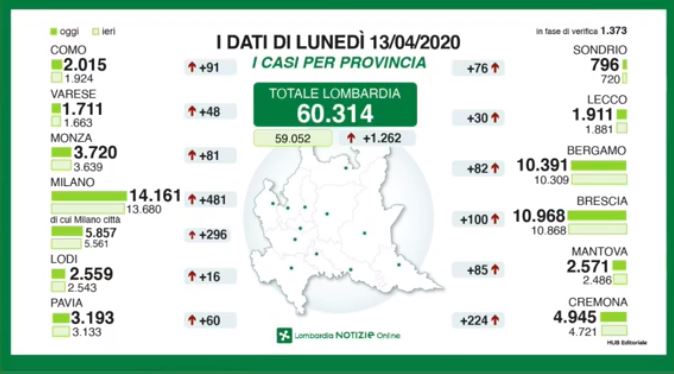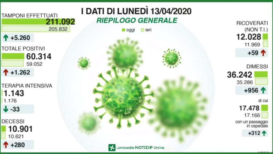 Bollettino regionale del 13 aprile con dati in chiaroscuro. Non particolarmente positivo l’aumento dei contagi (+1262) a fronte di un numero limitato di tamponi analizzati (5260). Torna a crescere il numero dei decessi (280), mentre continuano a calare i ricoveri in terapia intensiva (-33). Sono 82 i nuovi contagi accertati in provincia di Bergamo. Di seguito tutti i dati e le infografiche di Regione Lombardia.