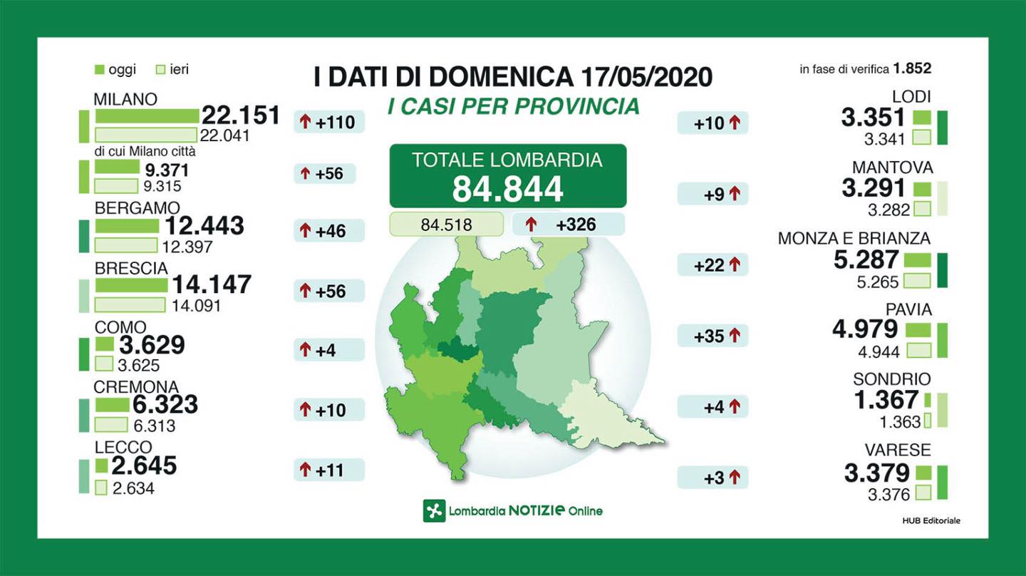Bollettino regionale del 17 maggio, sono 326 i nuovi casi accertati nelle ultime 24 ore (46 in Bergamasca) a fronte di 11809 tamponi processati. I decessi sono 69, i guariti 823. Prosegue lo svuotamento degli ospedali (-13 terapie intensive, -41 ricoveri non in terapia intensiva). Di seguito tutti i dati e le infografiche di Regione Lombardia.