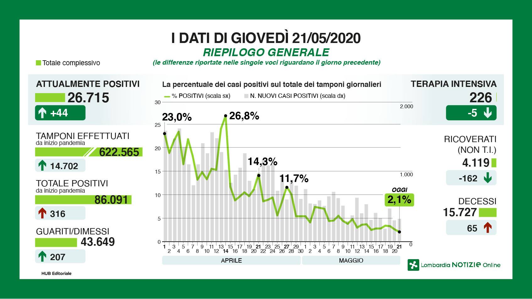 Bollettino regionale del 21 maggio, sono 316 i nuovi casi accertati nelle ultime 24 ore, a fronte di 14702 tamponi processati. I nuovi decessi sono 65, i guariti e i dimessi 207. Calano terapie intensive (-5) e ricoveri non in terapia intensiva (-162). In Bergamasca sono 48 i nuovi casi accertati. Di seguito tutti i dati e le infografiche di Regione Lombardia.