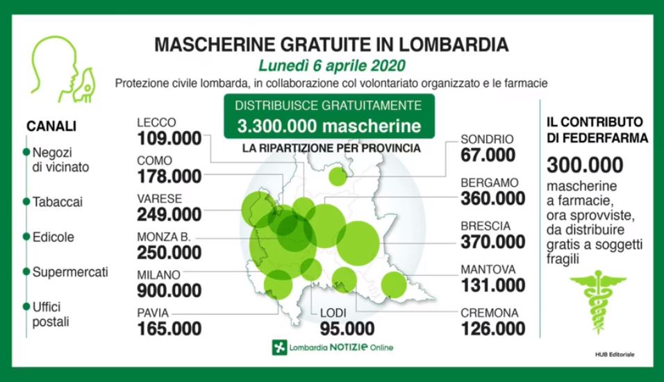 Buoni dati dal bollettino regionale lombardo del 5 aprile. A fronte di 8107 tamponi analizzati, sono 1337 i nuovi positivi, in calo rispetto agli ultimi giorni. Calano i decessi (249 nelle ultime 24 ore), calano i ricoveri nelle terapie intensive (-9). Contenuti anche i dati bergamaschi (+124 in provincia, +20 in città). Da lunedì Regione Lombardia distribuirà presso farmacie, supermercati, edicole, tabaccai e banche 3 milioni e 300mila mascherine in maniera gratuita (nella foto in basso tutti i dettagli).