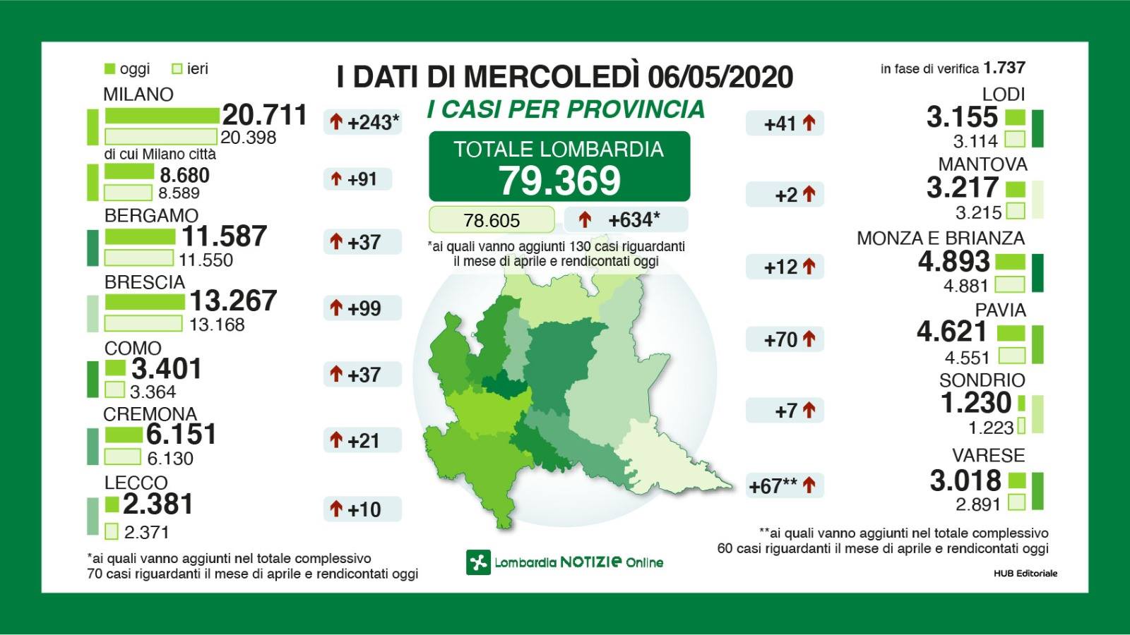 Bollettino regionale, sono 634 i nuovi casi certificati nelle ultime 24 ore a fronte di 14516 tamponi processati. Nuova impennata di decessi (222) mentre continua lo svuotamento degli ospedali (-29 terapie intensive, -122 ricoveri). I nuovi casi in Bergamasca sono 37. Regione Lombardia ha riconteggiato alcune voci (casi totali, casi nelle province di Milano e Varese). Di seguito tutti i dati e le infografiche di Regione Lombardia.