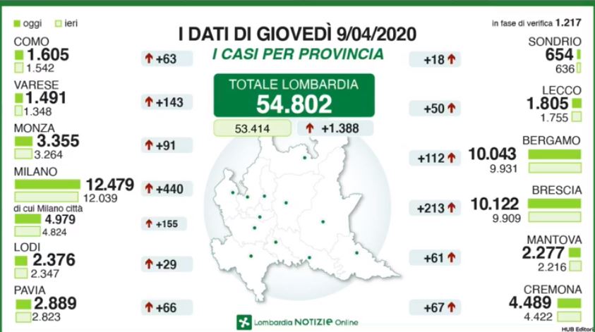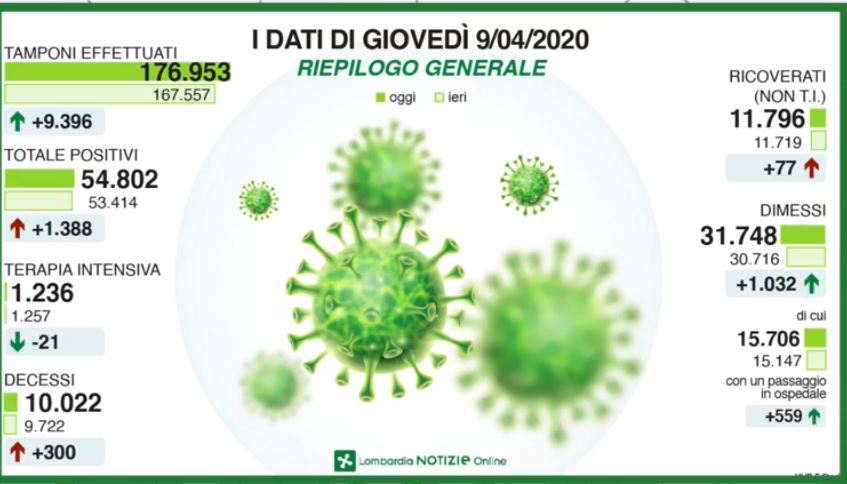 Dati sostanzialmente in linea con quelli dei giorni scorsi nel bollettino regionale del 9 aprile. Le persone contagiate dall’inizio dell’epidemia sono 54802, con un aumento di 1388 unità rispetto a mercoledì. Cresce sostanzialmente anche il numero dei tamponi analizzati (9396 nell’ultima giornata). Si registrano 300 decessi e 559 guarigioni. Calano ancora i ricoveri in terapia intensiva (-21). Di seguito i dati e le infografiche di Regione Lombardia.