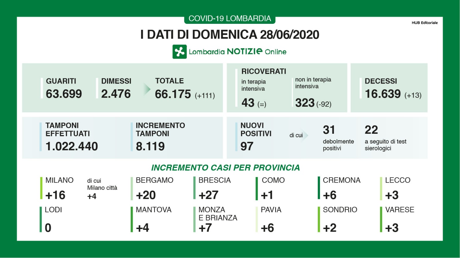 Bollettino regionale del 28 giugno, i nuovi casi registrati in Lombardia nelle ultime 24 ore sono 97 a fronte di 8119 tamponi processati. Dei 97 casi positivi di oggi, 31 evidenziano una positività ‘debole’ e 22 sono stati individuati a seguito dei test sierologici. Il rapporto tra nuovi casi e tamponi processati si attesta oggi all’1.19%, in rialzo rispetto alla giornata di ieri (quando era all’0.88%). I decessi registrati nelle ultime 24 ore sul territorio regionale sono 13, mentre i guariti e i dimessi sono 111. Stabili i pazienti ricoverati in terapia intensiva, calano i ricoverati con sintomi (-92). In provincia di Bergamo si registrano 20 nuovi casi certificati.