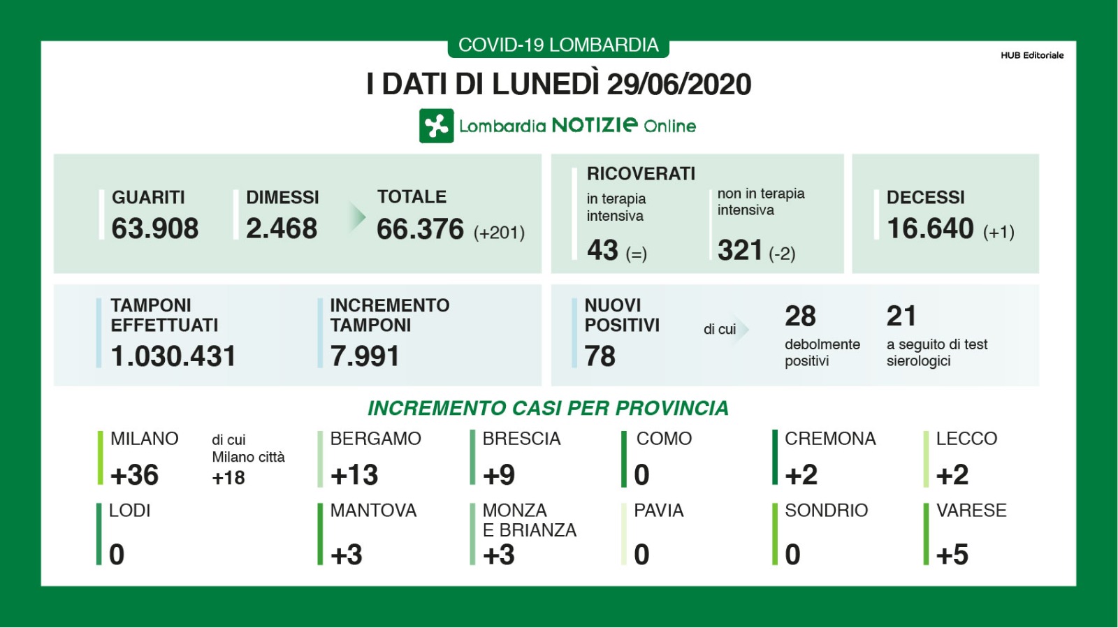 Bollettino regionale del 29 giugno, i nuovi casi registrati in Lombardia nelle ultime 24 ore sono 78 a fronte di 7991 tamponi processati. Dei 78 casi positivi di oggi, 28 evidenziano una positività ‘debole’ e 21 sono stati individuati a seguito dei test sierologici. Solo un decesso è stato registrato nelle ultime 24 ore sul territorio regionale, mentre i guariti e i dimessi sono 201. Stabili i pazienti ricoverati in terapia intensiva, calano i ricoverati con sintomi (-2). In provincia di Bergamo si registrano 13 nuovi casi certificati. Quattro province (Como, Lodi, Pavia e Sondrio) non registrano nuovi casi.