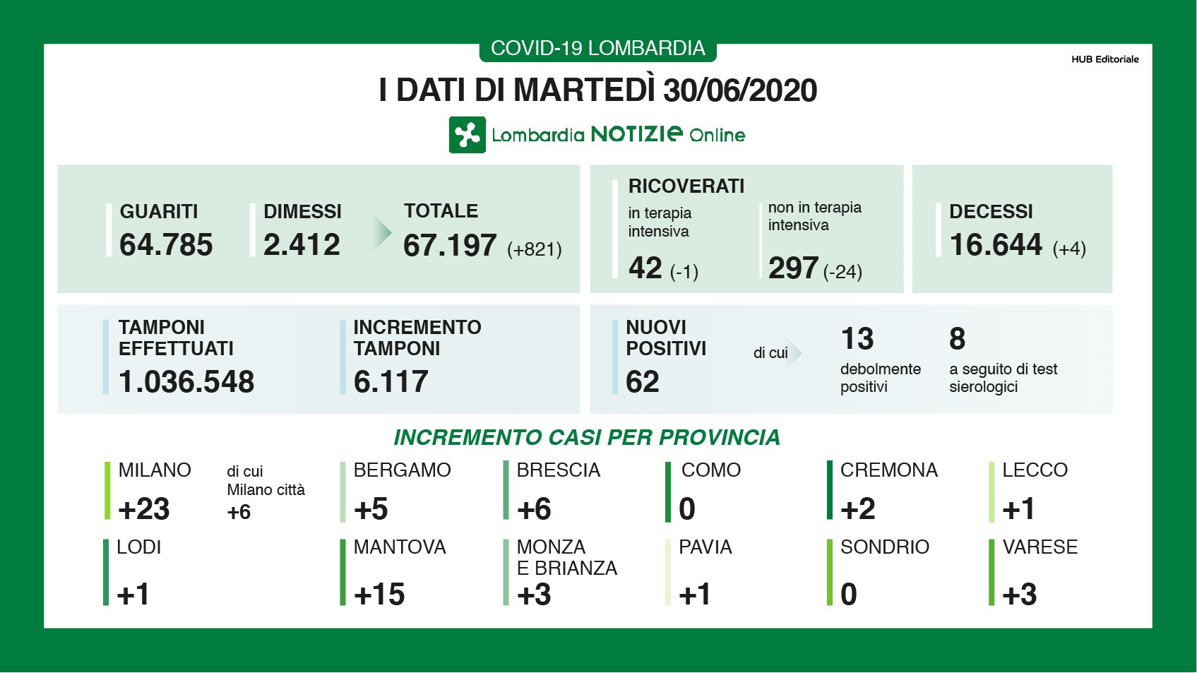Bollettino regionale del 30 giugno, i nuovi casi registrati in Lombardia nelle ultime 24 ore sono 62 a fronte di 6117 tamponi processati. Dei 62 casi positivi di oggi, 13 evidenziano una positività ‘debole’ e 8 sono stati individuati a seguito dei test sierologici. Sono 4 i decessi registrati nelle ultime 24 ore sul territorio regionale, mentre i guariti e i dimessi sono 821. Calano i pazienti ricoverati in terapia intensiva (-1), così come i ricoverati con sintomi (-24). In provincia di Bergamo si registrano 5 nuovi casi certificati. Nessun nuovo caso è stato riscontrato nelle province di Como e Sondrio.
