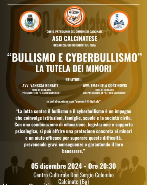 Importante e interessante iniziativa giovedì 5 dicembre alle 20.30 a Calcinate contro il bullismo e il cyberbullismo nei confronti dei nostri minori. L’evento, organizzato dall’Asd Calcinatese al Centro Culturale Don Sergio Colombo e che vedrà il patrocinio dell’amministrazione comunale del paese, avrà come argomento centrale i modi per difendersi da tali atti, “con una combinazione di educazione, legislazione e supporto psicologico”. Relatori l’avvocatessa Vanessa Bonaiti e l’avvocatessa Emanuela Cortinovis, da sempre in prima linea nella tutela dei bambini e dei ragazzi, rispettivamente presidente e vicepresidente de “Il Faro Giuridico”. Tra i temi gli episodi che vanno condannati nel mondo del calcio e da qui l’impegno sia dell’Asd Calcinatese che del suo allenatore, Federico Perelli, molto sensibile al tema dopo un più di un decennio passato sulle panchine dei principali club della Bassa Bergamasca. Il nostro consiglio è quello di prendere parte all’iniziativa sia per la problematica, molto sentita dai nostri adolescenti, con molti giovani che ne soffrono, che per la professionalità e la competenza di chi condurrà la serata. “La lotta contro il bullismo e il cyberbullismo è un impegno che coinvolge istituzioni, famiglie, scuole e società civile”, ci spiega l’avvocatessa Vanessa Bonaiti, e tutti dobbiamo fare la nostra parte perché certi episodi non accadano mai più. Ben vengano quindi appuntamenti come quelli di giovedì, fondamentali per sensibilizzare l’intera cittadinanza.