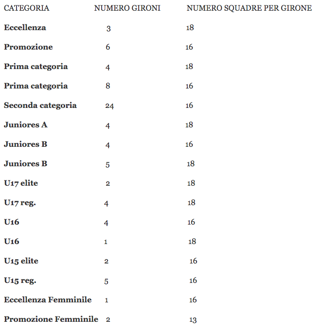 Considerata l’entità numerica delle iscrizioni ricevute, il Consiglio ha deciso di mantenere l’attuale format dei campionati regionali quanto al numero di gironi adeguando solamente il numero delle squadre per girone al fine di conservare la parità numerica di partecipanti a ciascun raggruppamento, evitando così turni di riposo in considerazione anche dell’eguale numero di giornate che l’eventuale girone dispari comporterebbe rispetto ad un girone a pari squadre.