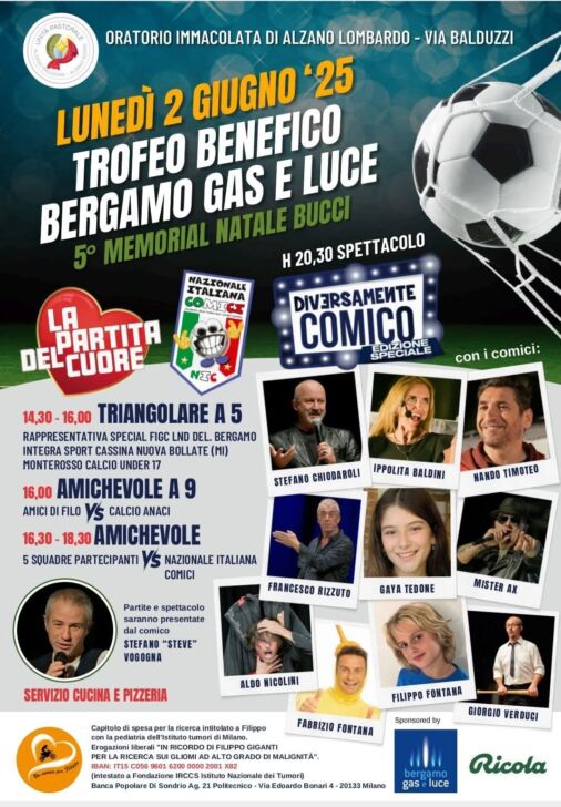 Un ricordo per Natale Bucci, indimenticato vicepresidente dell’Immacolata ora confluita nel Città di Alzano anche a livello di prima squadra, col Memorial a lui dedicato. Ma non si vive di solo calcio. Le partite sono al pomeriggio e il divertimento la sera con lo spettacolo Diversamente Comico. Sarà un 2 giugno speciale, ad Alzano Maggiore, all’oratorio dell’Immacolata, via Monsignor Balduzzi 11, sotto l’egida organizzativa di Maurizio Mangili, padrone di casa con pluridecennale esperienza dirigenziale e da arbitro CSI.