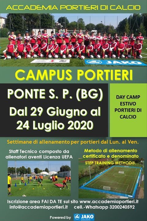 L’Accademia Portieri di Calcio organizza un camp per portieri dal 29 giugno al 24 luglio 2020. La location prescelta è Ponte San Pietro, lo staff tecnico sarà compostro da allenatori dotati di licenza Uefa. Ci si può iscrivere andando sull’area “Fai da te” del sito www.accademiaportieri.it. Ulteriori informazioni possono essere chieste alla mail info@accademiaportieri.it o, via whatsapp, al numero 3200240592.