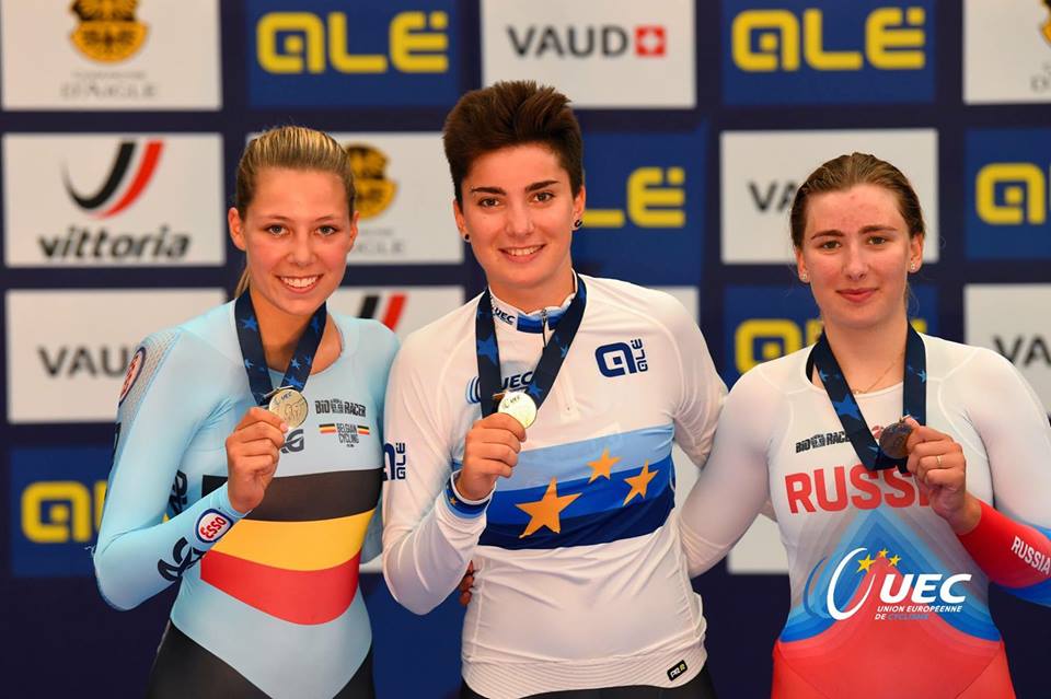 La festa si è poi ulteriormente arricchita perché nel tardo pomeriggio è arrivata anche la medaglia d’oro per la junior Gloria Scarsi che si è presa una grande rivincita dopo i mondiali sfortunati di una settimana fa. Infatti la ligure – che settimana scorsa era arrivata quarta nello scratch nella rassegna iridata e quarta anche nell’americana – ha corso con estrema lucidità e ha dimostrato di essere una velocista di razza anche a livello internazionale. Se nello scratch mondiale era andata via la più classica delle “fughe bidone”, la gara di stamane è stata completamente diversa. La ligure – in maglia Valcar-PBM da tre stagioni –ha tenuto controllata la corsa, è risalita nelle prime posizioni negli ultimi giri, si è posizionata in seconda posizione all’ultimo giro e con un colpo di reni clamoroso è andata a prendersi quella medaglia d’oro che invece le era sfuggito una settimana fa battendo sul filo di lana la belga ShariBossuyts e la russa Anastasia Lukashenko.