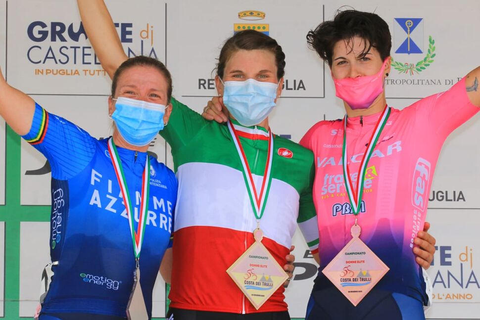 Per la seconda volta in carriera la ligure Ilaria Sanguineti conquista un podio ai Campionati Italiani; infatti nella splendida gara organizzata in Puglia e particolarmente sentita dal pubblico che non ha fatto mancare il tifo, la portacolori della Valcar – Travel & Service ha trovato il miglior piazzamento stagionale. Il titolo tricolore è andato invece a Elisa Longo Borghini, mentre la medaglia d’argento a Tatiana Guderzo.