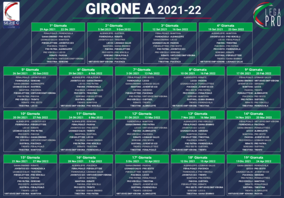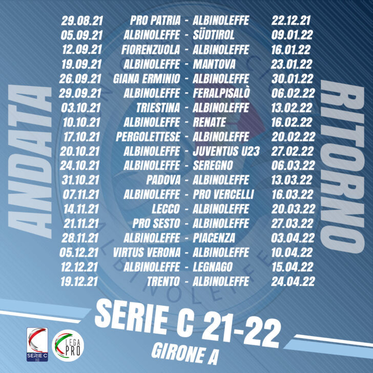 Sarà il prossimo 29 agosto, salvo anticipi e posticipi, al “Carlo Speroni” di Busto Arsizio, contro i padroni di casa della Pro Patria, lo start del nuovo campionato di serie C (girone A) per l’AlbinoLeffe riaffidato a Michele Marcolini. Il sorteggio dei calendari s’è tenuto presso la sede della Lega Pro a Firenze a conclusione di una giornata comprensiva della definizione della composizione dei tre raggruppamenti e del tabellone dei primi due turni eliminatori della Coppa Italia di categoria. Per i blucelesti, in quel caso, si ospita il Lecco sabato 21 agosto. Nella seconda giornata della regular season, invece, ospite il Südtirol prima della trasferta con il Fiorenzuola neopromosso. Il 3 ottobre si va dalla Triestina; giro di boa il 19 dicembre al “Briamasco” di Trento. Contro la stessa avversaria, ovviamente, la chiusura del tra le mura amiche il 24 aprile 2022.