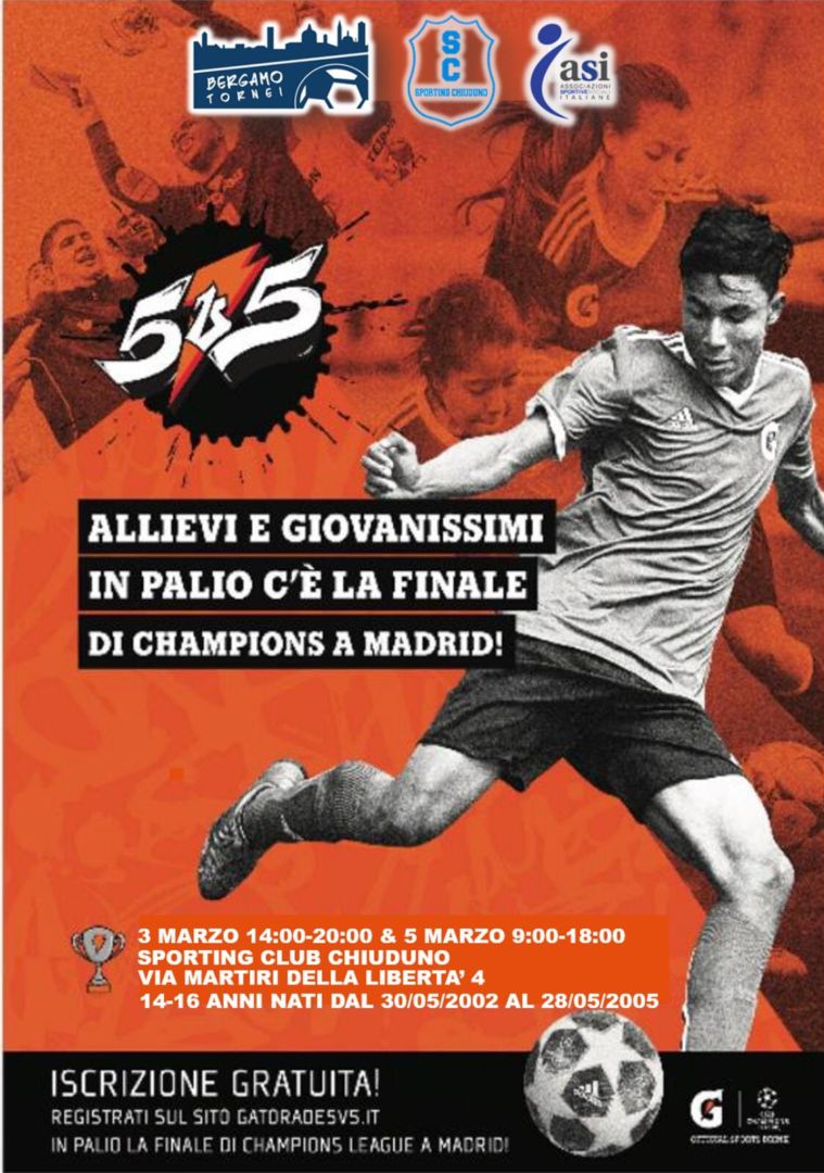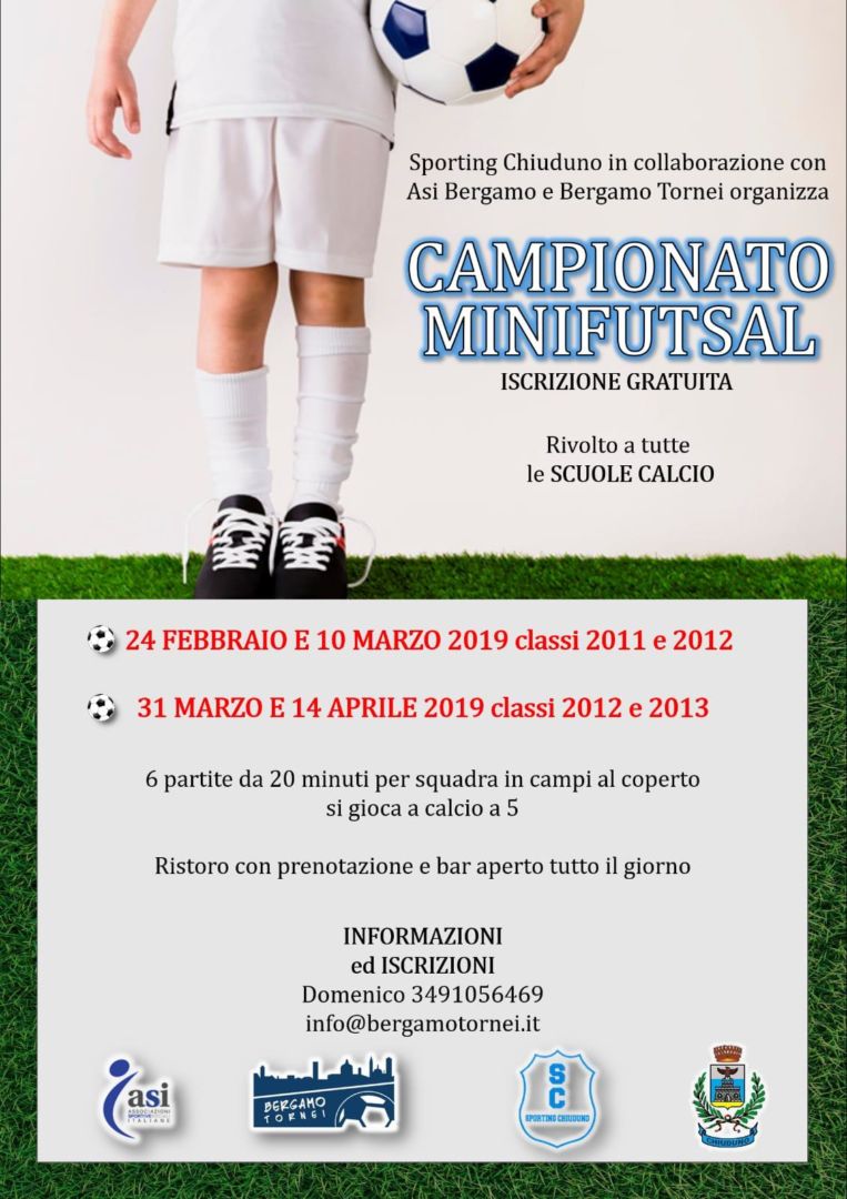 Campionato minifutsal allo Sporting Chiuduno 31 Gennaio, 2019 Rivolto alle scuole calcio: il 24-2 e 10-3 per le classi 2011-12. il 31-3 e 14-4 per le classi 2012-13 Allievi e Giovanissimi il 3 e 5 marzo. Info: Domenico 349-1056469 – info@bergamotornei.it