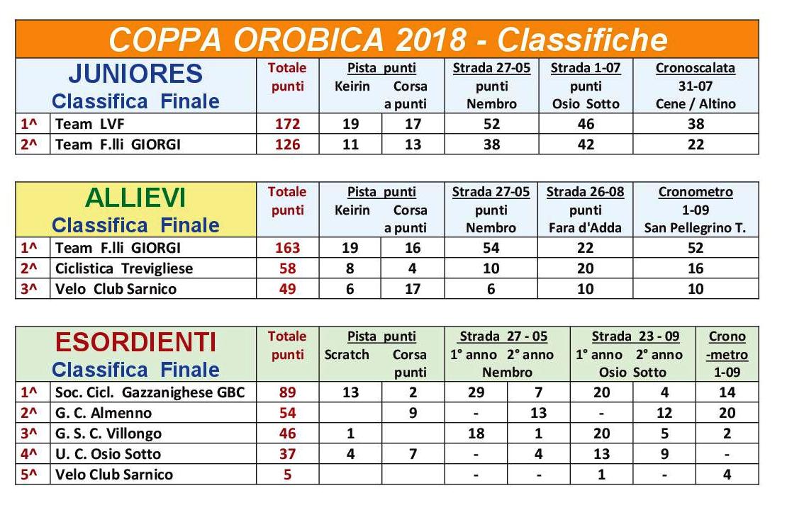 A vincere nelle rispettive categorie la Coppa Orobica 2018 sono state il Team LVF tra gli Juniores, il Team F.lli Giorgi tra gli Allievi e la Sc Gazzanighese tra gli Esordienti.