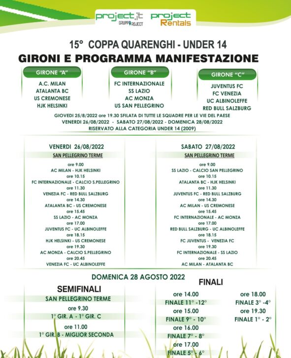 Venerdì 26 agosto calcio di inizio dei colleghi “maschietti” per la Coppa Quarenghi Under 14 che – sempre allo Stadio Comunale di San Pellegrino Terme – vedrà la partecipazione di Milan, Atalanta, Cremonese ed Helsinki nel girone A; Inter, Lazio, Monza, San Pellegrino nel girone B; Juventus, Venezia, Albinoleffe e Red Bull Salisburgo nel girone C.