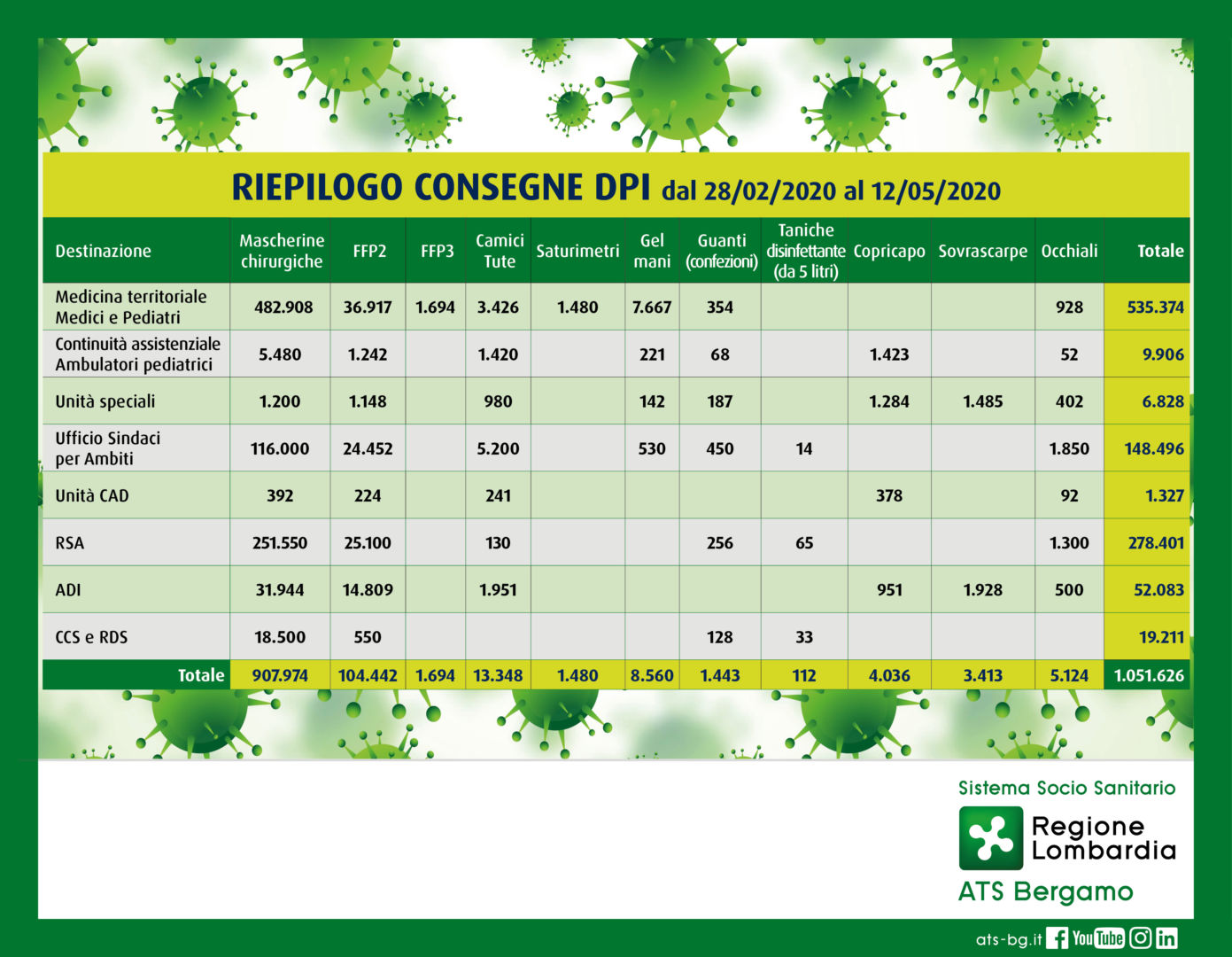Hanno superato il milione di pezzi (precisamente sono 1.051.626) i dispositivi di protezione individuale che l’Agenzia di Tutela della Salute di Bergamo ha distribuito dal 28 febbraio al 12 maggio. Nel dettaglio si tratta di 695.134 mascherine chirurgiche, 85.424 maschere FFP2, 1.694 maschere FFP3, 10.047 camici/tute, 1.480 saturimetri, 7.537 confezioni di gel per le mani, 1.436 confezioni di guanti, 112 taniche di disinfettante da 5 litri, 3.957 copricapo, 3.413 sovra scarpe, 2.397 occhiali.