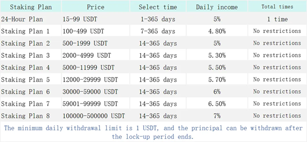 Piano di Staking 4 Intervallo di investimento: 5.000 – 11.999 USDT Rendimento giornaliero: 5,5% Numero di investimenti: illimitato
