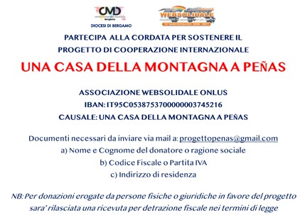 La Casa della montagna a Peñas si presenta come un progetto di cooperazione internazionale e interculturale, realizzato grazie ad una solida cordata che lega oltre confine le Orobie bergamasche e le Ande boliviane, e per costruire insieme un luogo di aggregazione e formazione per giovani boliviani, per favorire opportunità di incontri e conoscenze interculturali anche per giovani e studenti