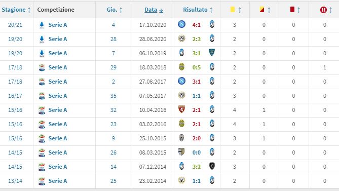 L’esordio ufficiale del Gewiss Stadium con la Curva Nord nuova di trinca e il più recente poker sporco sulla gobba a Napoli. Marco Di Bello, l’arbitro brindisino designato per Atalanta-Roma di domenica 20 dicembre (ore 18), valida per la tredicesima giornata del campionato di serie A, nel bilancio (vedi screenshot da Transfermarkt in coda all’articolo) delle partite dirette complessivamente sfavorevole ai nerazzurri ha tenuto a battesimo il restyling del santuario del pallone cittadino il 6 ottobre 2019 nel 3-1 al Lecce e il 17 dello stesso mese, ma quest’anno, il 4-1 al “San Paolo” a favore del Napoli.