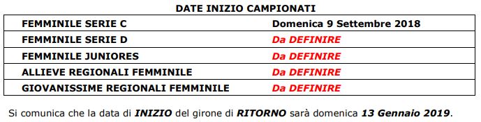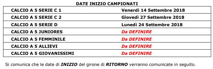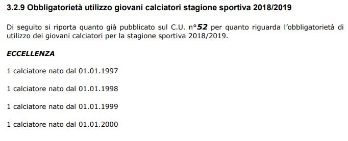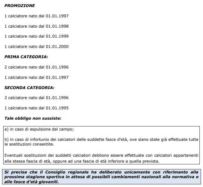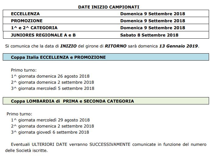 Il 9 settembre 2018 cominceranno i campionati dilettantistici che vanno dall’Eccellenza alla Seconda Categoria (la Terza, gestita dalla Delegazione provinciale, presumibilmente partirà il 23 settembre). Coppe dal 26 (Eccellenza e Promozione) e dal 29 agosto (Prima e Seconda). Di seguito tutte le date e le regole sull’utilizzo dei giovani, categoria per categoria.