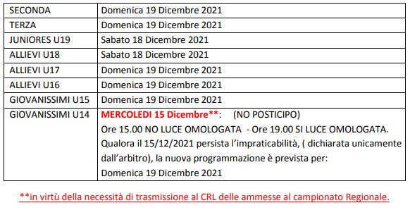 Si rappresenta infine che nella giornata di lunedì 13 dicembre p.v. saranno comunicate le date di recupero delle gare non giocate nelle date del 08 dicembre / 09 dicembre 2021.