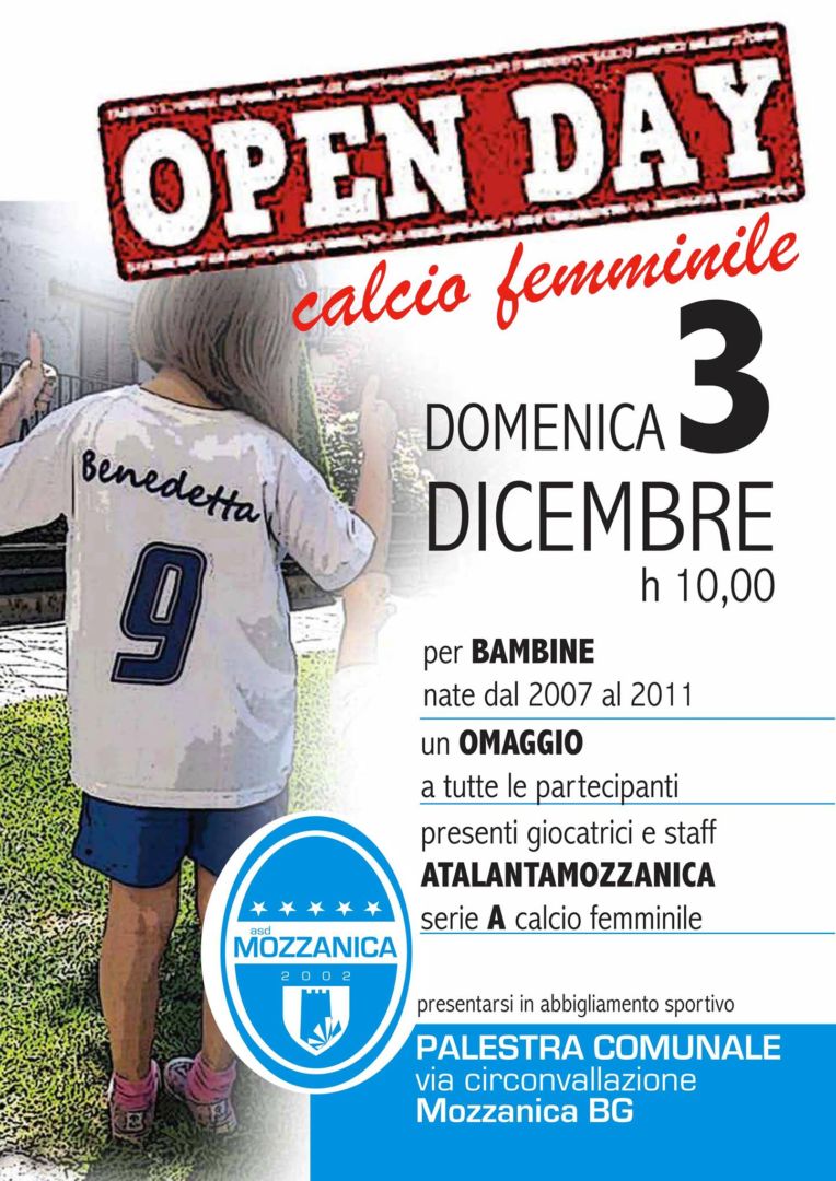 Bella iniziativa dell’Atalanta Mozzanica che domenica 3 dicembre un open day dedicato al calcio femminile. L’appuntamento è fissato per le 10 alla palestra comunale di via Circonvallazione a Mozzanica. L’open day è riservato a bambine nate dal 2007 al 2011. A tutte le partecipanti sarà riservato un omaggio. Saranno presenti giocatrici e staff della prima squadra dell’Atalanta Mozzanica. Occorrerà presentarsi in abbigliamento sportivo.