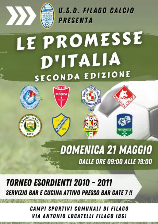 Domenica di grande calcio a Filago. Il Filago Calcio presenta la seconda edizione torneo “Le Promesse d’Italia” riservato alla categoria Esordienti 2010-2011. La manifestazione si svolgerà domenica 21 maggio dalle 9 alle 19 ai campi sportivi comunali di via Antonio Locatelli. Sarà attivo il servizio bar e cucina presso il Bar Gate 7.