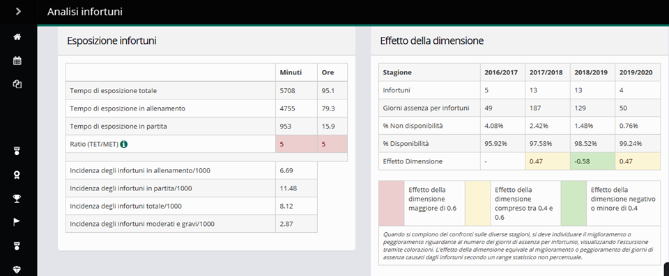 Il gestionale Weakrisk Sport Solutions Sport Solutions ha effettuato un’implementazione in merito agli infortuni facendo riferimento all’incidenza di questi ogni 1000 ore di esposizione e quindi attenendosi all’aspetto scientifico applicato.