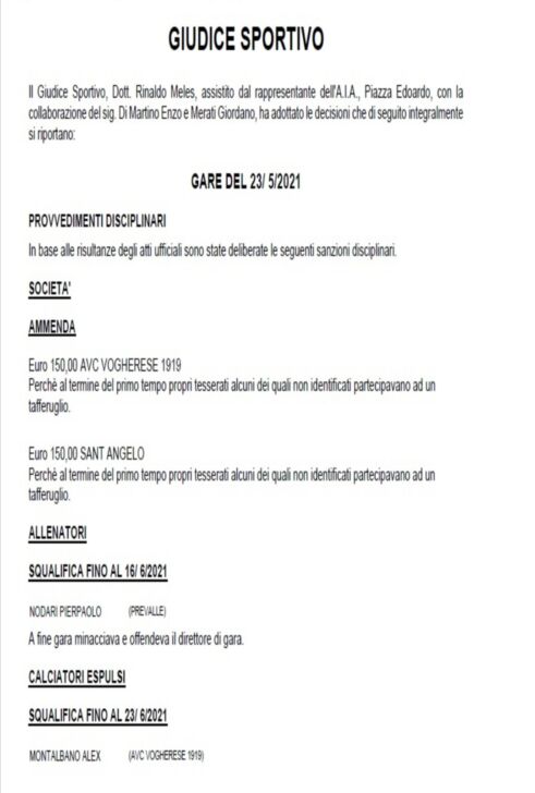 Eccellenza, le decisioni del giudice sportivo dopo il settimo turno 27 Maggio, 2021 Di seguito l’elenco dei provvedimenti disciplinari dopo il settimo turno del campionato d’Eccellenza: MDC