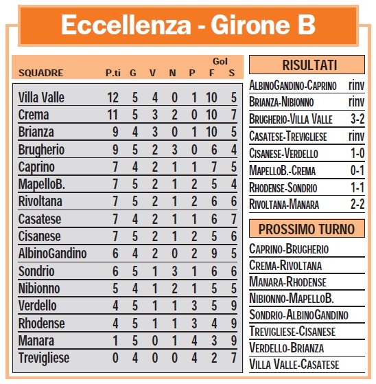 Brugherio-Villa Valle 3-2: 2’ pt Bosio (VV), 7’ st Lipino (B), 28’ st Delcarro (VV), 30’ st Zanoni (B), 45’ st Montalbano (B)