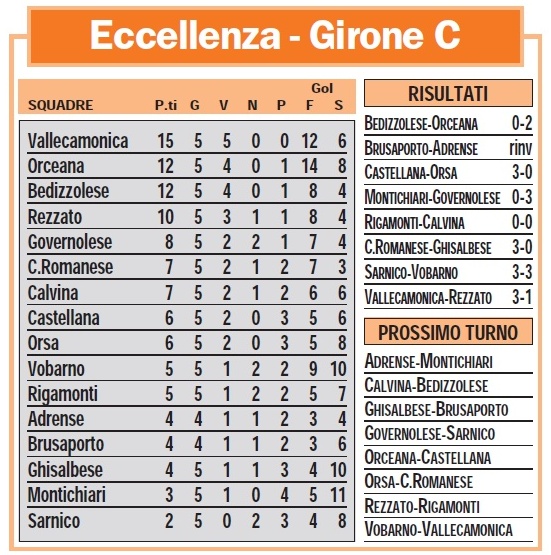 Sarnico-Vobarno 3-3: 21’pt Cama (V), 28’pt Abdou (S), 2’st Abdou (S), 20’st rig. Paghera (V), 33’st rig. Paghera (V), 44’st rig. Andrè (S)