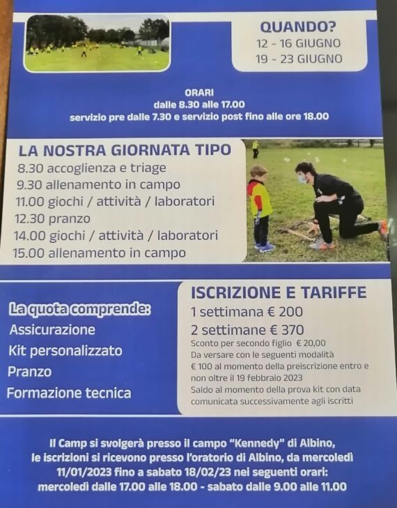 La Falco Albino ha prolungato i termini delle iscrizioni per i primissimi Summer Camp e nel frattempo ha già fissato le date per i tornei primaverili dedicati alle varie fasce d’età. Si raccolgono nominativi a oltranza fino al 28 febbraio (la deadline era l’11) presso l’Oratorio di Albino, la cui società omonima nelle vesti di co-organizzatrice ospiterà la formazione di ragazze e ragazzi dai 6 ai 14 anni sul campo del “Kennedy” in due cicli successivi e contigui: da lunedì 12 a venerdì 16 giugno e da lunedì 19 a venerdì 23 dello stesso mese. Accanto agli istruttori del club nerazzurro ci saranno gli ex atalantini Matteo Moranda (preparatore atletico) e Michael Agazzi (ex portiere) di Saga (Kids).