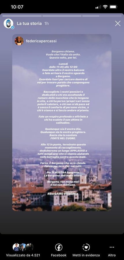 Balconi sì, magari anche terrazzi. Ma mica per il solito flash mob canterino. “Lunedì dalle 11.45 alle 12 guardate oltre il vostro balcone e fate arrivare il vostro sguardo a Bergamo. Guardate fuori per cercare dentro di voi per trovare parole che compongano preghiere. Alle 12 in punto dedicheremo un lungo applauso a tutti quegli eroi che ci stanno aiutando nella battaglia contro questo male”. Per malati, parenti e medici: Federica Percassi invita l’Italia intera ad affacciarsi fisicamente o idealmente sul territorio più colpito dall’emergenza Coronavirus, direttamente da una story del proprio profilo Instagram.