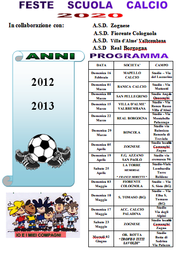 Alessandro Bonacina Allenatore di Base B Uefa e Giuseppe Viscardi, allenatore di Terza Categoria e Preparatore Giovani hanno già diffuso il programma delle feste Scuola Calcio 2020, manifestazione che vede la collaborazione di Zognese, Fiorente Colognola, Villa d’Almè ValBrembana e Real Borgogna.
