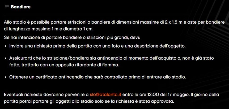 Non saranno ammesse borse di dimensioni superiori al formato A4 all’interno dello stadio.