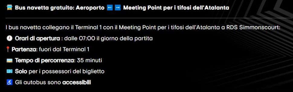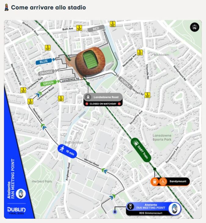 I tifosi dell’Atalanta si ritroveranno al Meeting Point presso RDS Simmonscourt, una grande area all’aperto a sud della Dublin Arena. È il posto perfetto per conoscere altri tifosi, godersi gli spettacoli vivo, mangiare o bere qualcosa e molto altro!