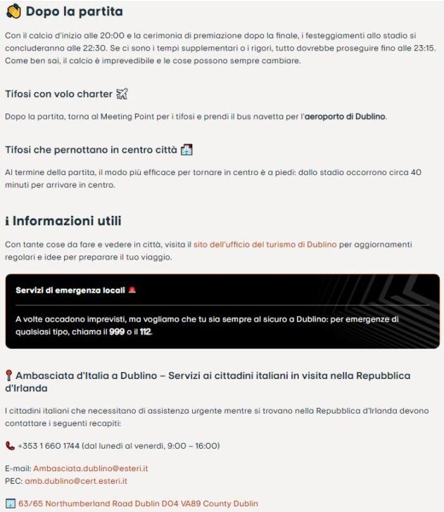 Dopo la partita, i tifosi che viaggiano con un volo charter dovranno tornare al Meeting Point e prendere il bus navetta per l’aeroporto.