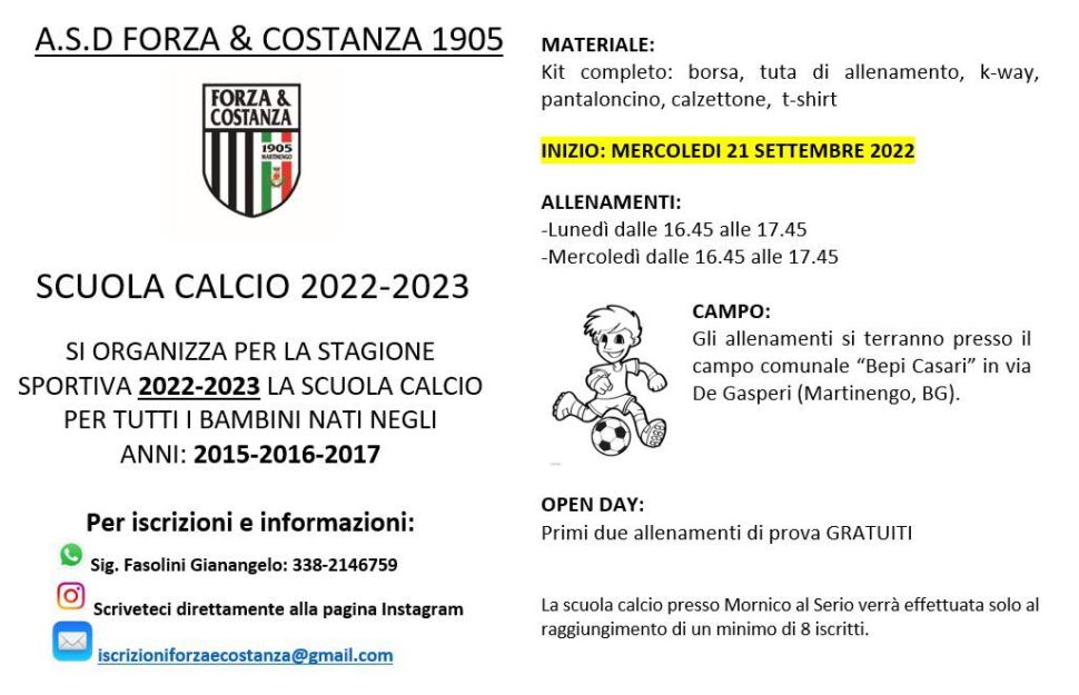 Forza e Costanza, dal 21 settembre il via alla Scuola Calcio 8 Settembre, 2022 Di seguito la locandina completa con tutte le informazioni a riguardo: