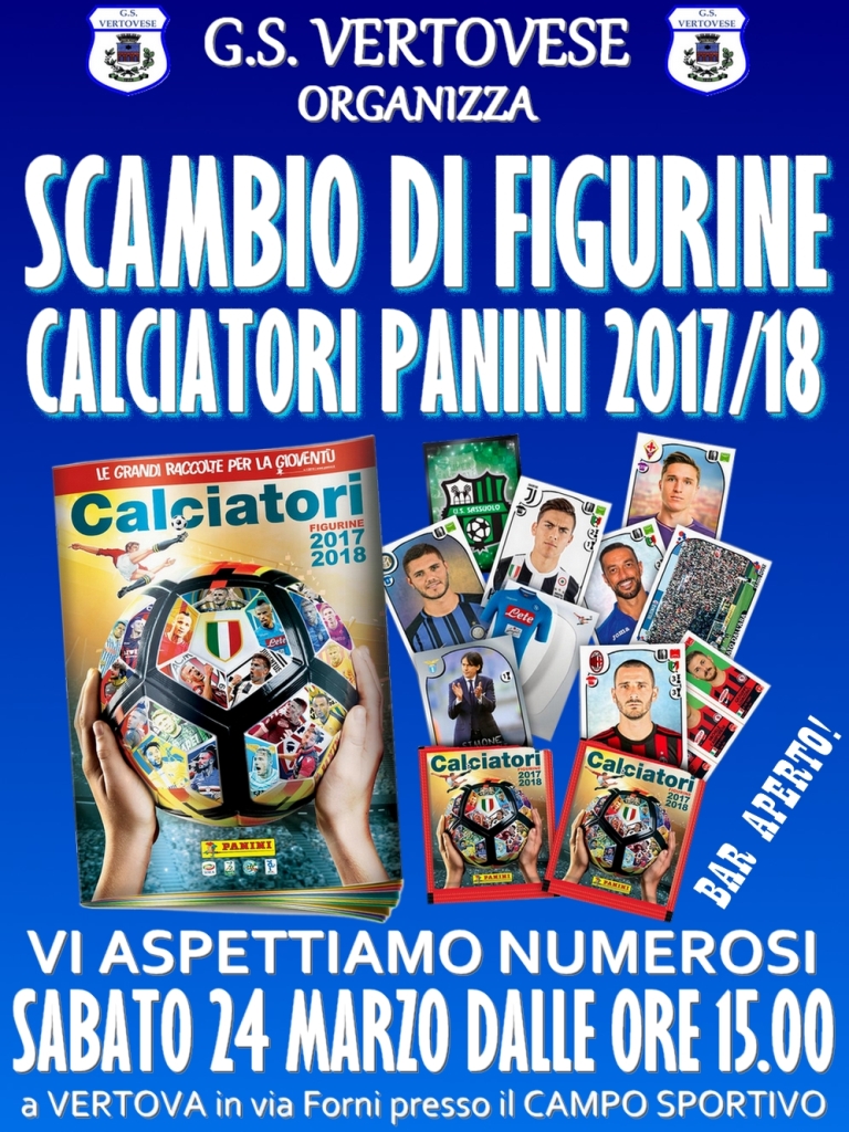La Vertovese organizza lo scambio di figurine Calciatori Panini 2017/18. Per tutti gli interessati il ritrovo è sabato 24 marzo dalle ore 15 a Vertova, in via Forni (al campo sportivo)