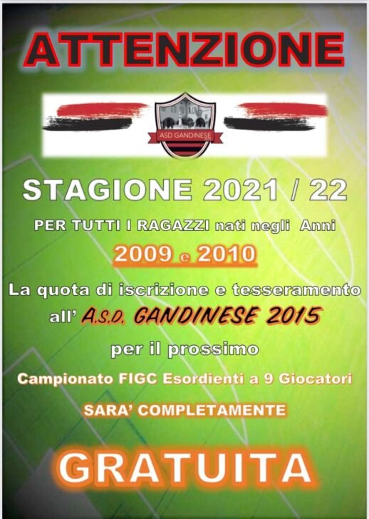 Con il patrocinio del Comune di Gandino e delle Cinque terre della Val Gandino, la Gandinese 2015 organizza il Football Camp 2021, due settimane di calcio e divertimento con allenatori qualificati e preparatore specifico per portieri, sotto la direzione degli espertissimi Matteo Bonomi, Roberto Bonazzi e Pietro Picinali.